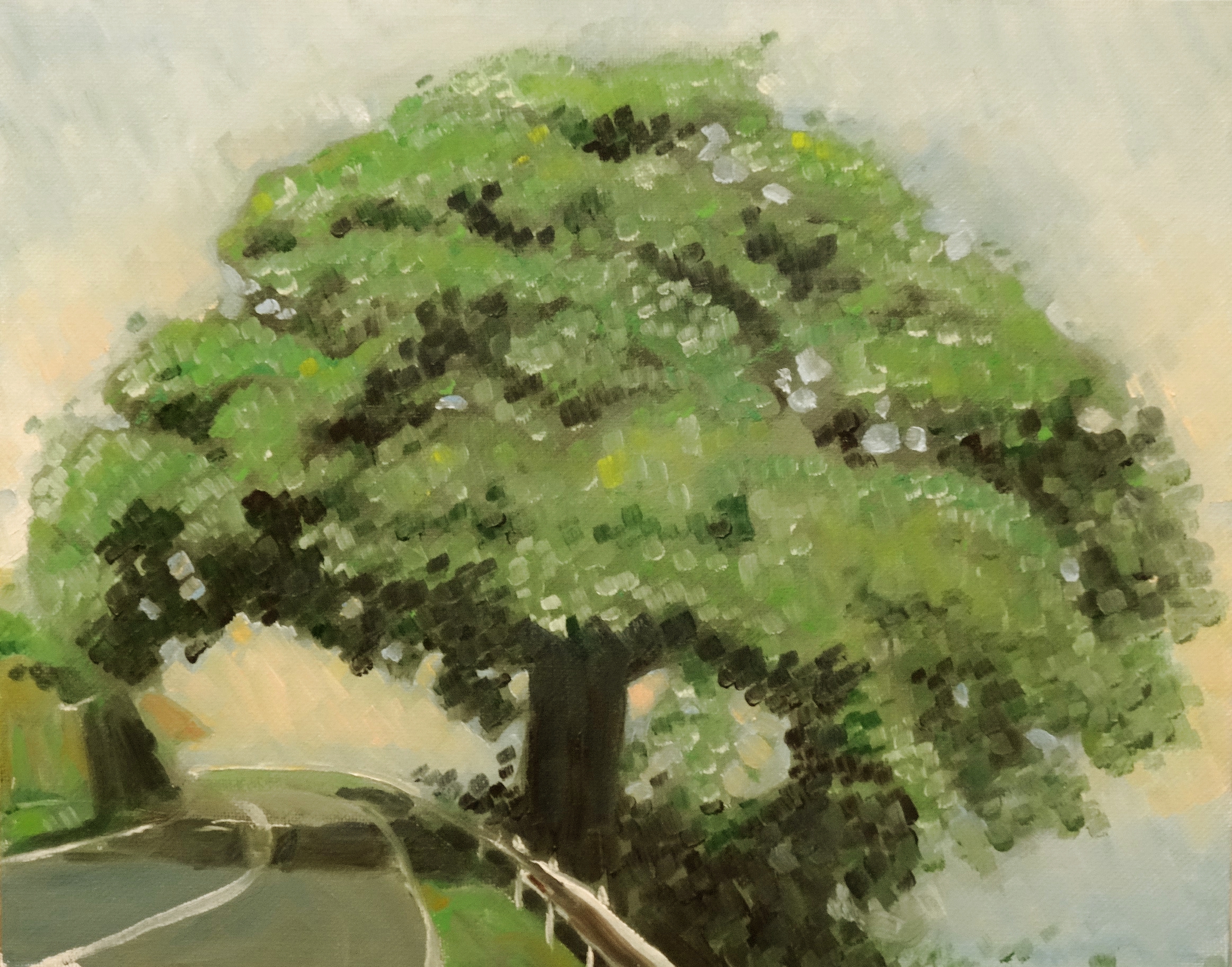 Je rajoute un petit arbre à ma collection. J’aimais bien que l’arbre entoure la route sur la photo. Cela apparaît moins sur la peinture. Il parait que c’est le seul arbre qui aurait survécu à l’éruption du volcan.