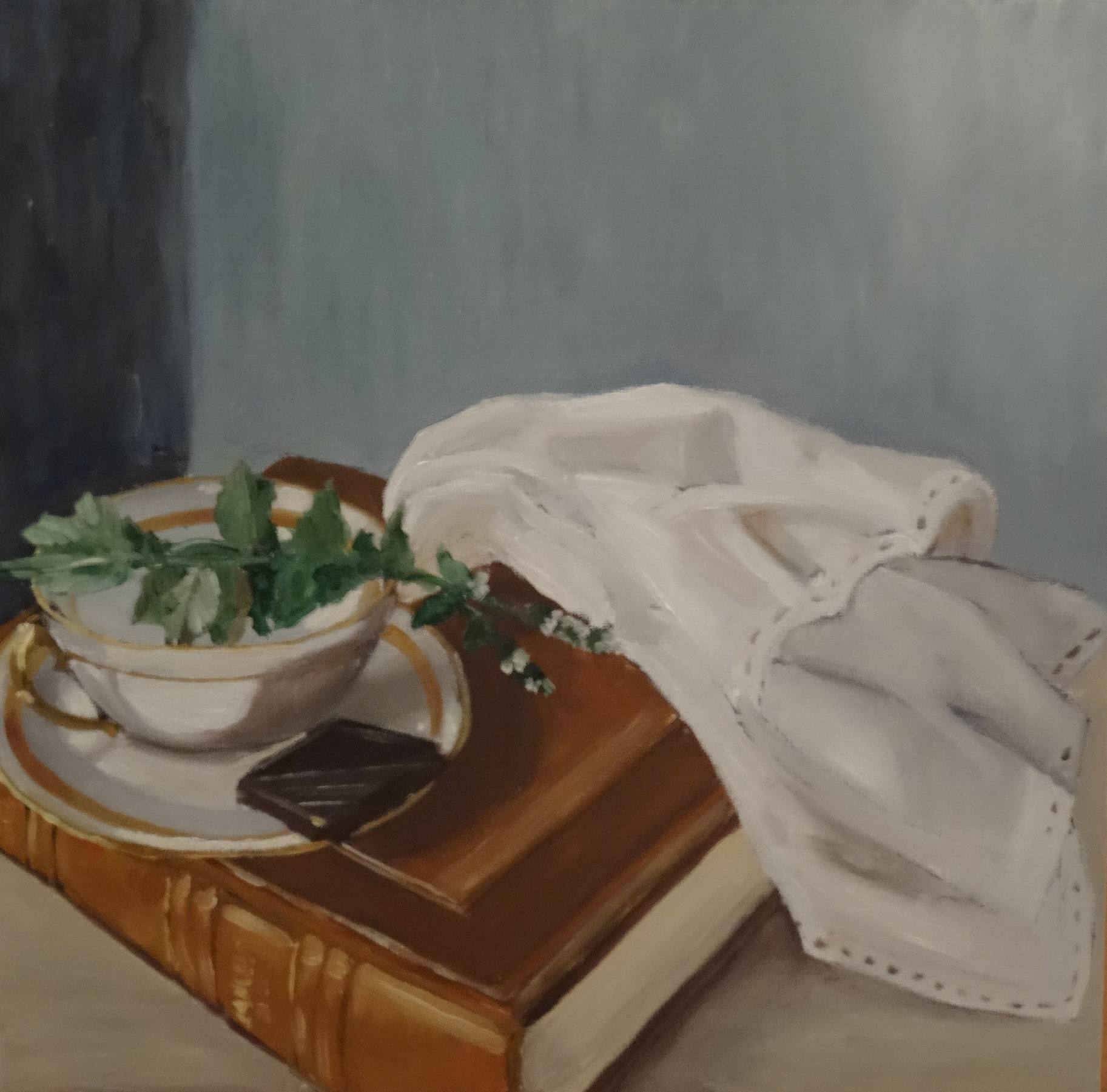 La photo rend le fond gris alors qu’en réalité il est bleu. Je voulais utiliser une couleur proche de la complémentaire des ocres du livre et de l’or de la tasse, sans que le bleu prenne trop de place.