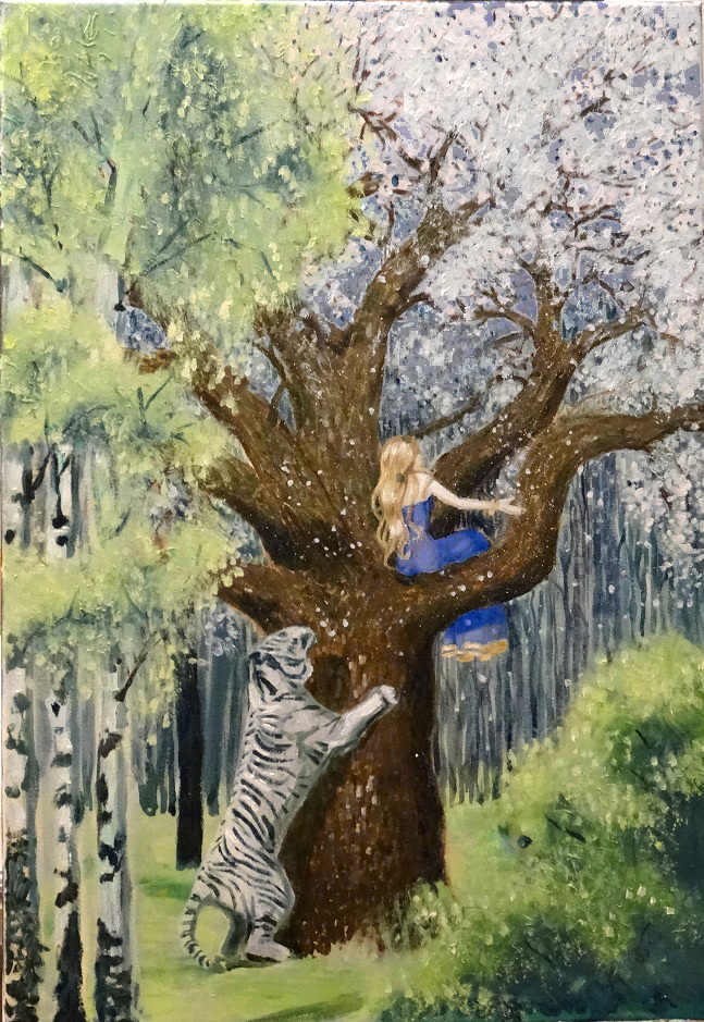 J’ai réalisé cette toile pour un ami, né en Avril 1986. Le tigre représente son signe astrologique chinois et l’arbre était à l’origine un cerisier en fleurs. Il a épaissi et pris de l’écorce avec le temps car je l’ai réalisé en plusieurs fois.