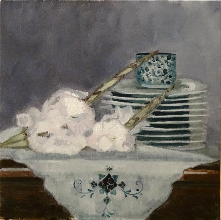 10/09/2014 : Blancs Glaïeuls et pile d’assiettes – Huile sur toile 30 x 30 cm