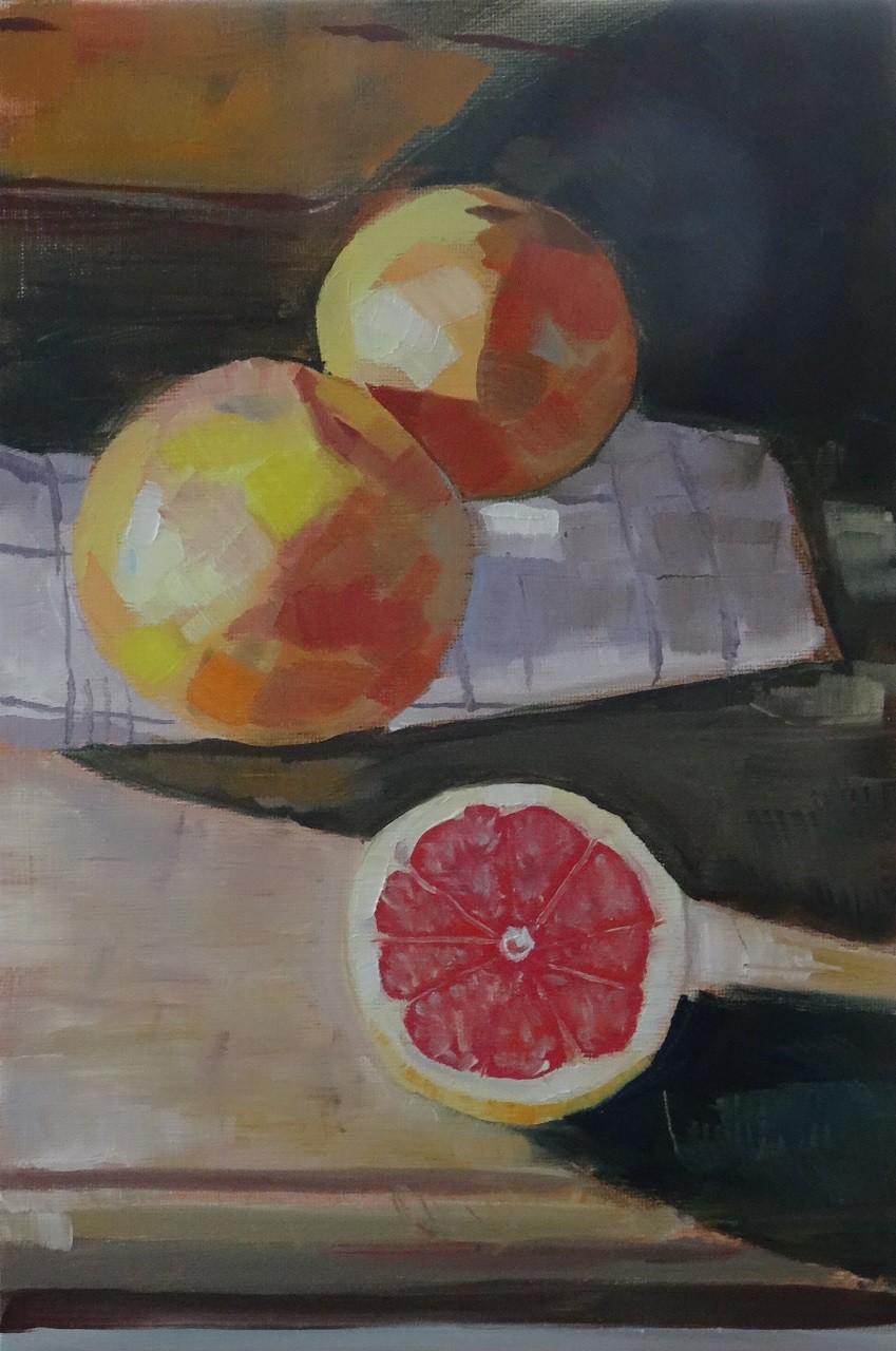 J’ai voulu me concentrer sur les couleurs des pamplemousses en faisant des touches moins fines que d’habitudes. Les ombres sur les pamplemousses en particulier sont difficiles car elles sont colorées (elles virent au rouge), mais sombres.