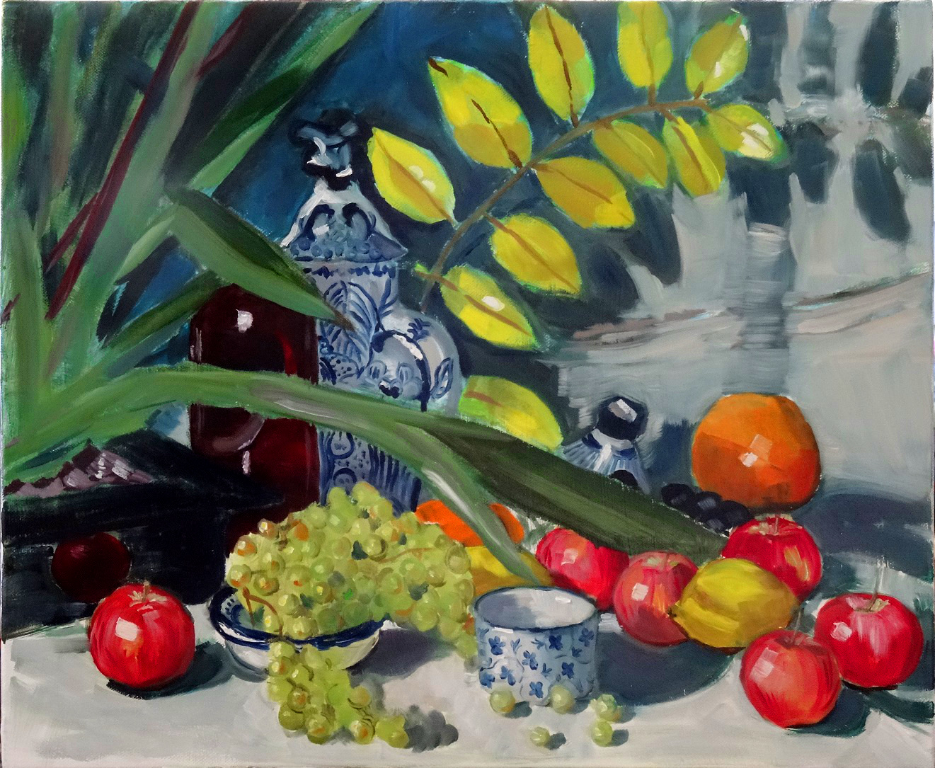 Pour revenir à la peinture d’aujourd’hui, je ne me suis pas trop focalisée sur la composition mais plutôt sur l’équilibre couleurs chaude – couleurs froides. Suite à la vidéo d’un artiste de la nature morte, qui disait que quand la lumière est froide, les ombres doivent être chaudes et vice et versa, j’ai voulu essayé. Ma lumière est jaune, donc chaude, mes ombres sont bleues.