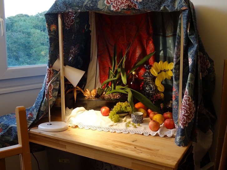 Je me suis fabriquée une caisse à natures mortes. C’est une planche de bois pour le support, et les arrêtes d’un cube en bois. Ca me permet de glisser des tissus pour le fond, et de recouvrir à la fois la lampe de bureau que j’ai acheté pour l’occasion et toute la nature morte.
