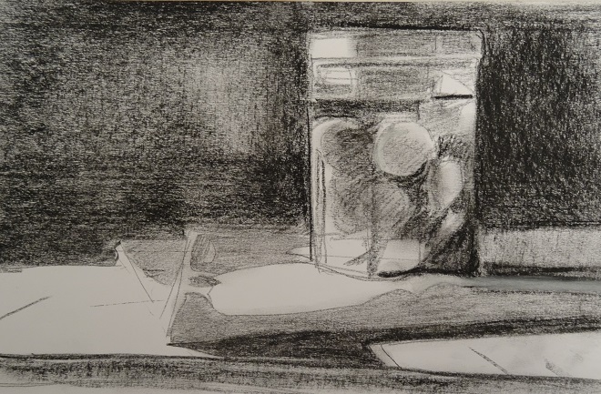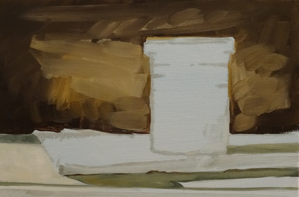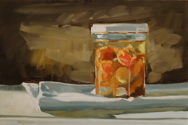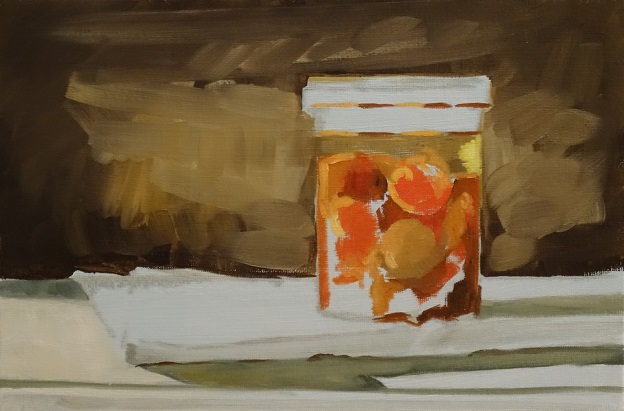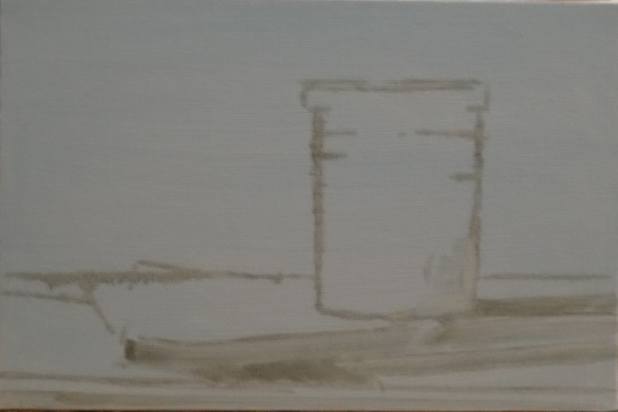 L’ébauche (j’ai choisi du bleu de Ceruleum et un mélange de vernis de Damar et de white spirit pour le fond, je voulais que ce soit complémentaire avec l’orange des tomates) :