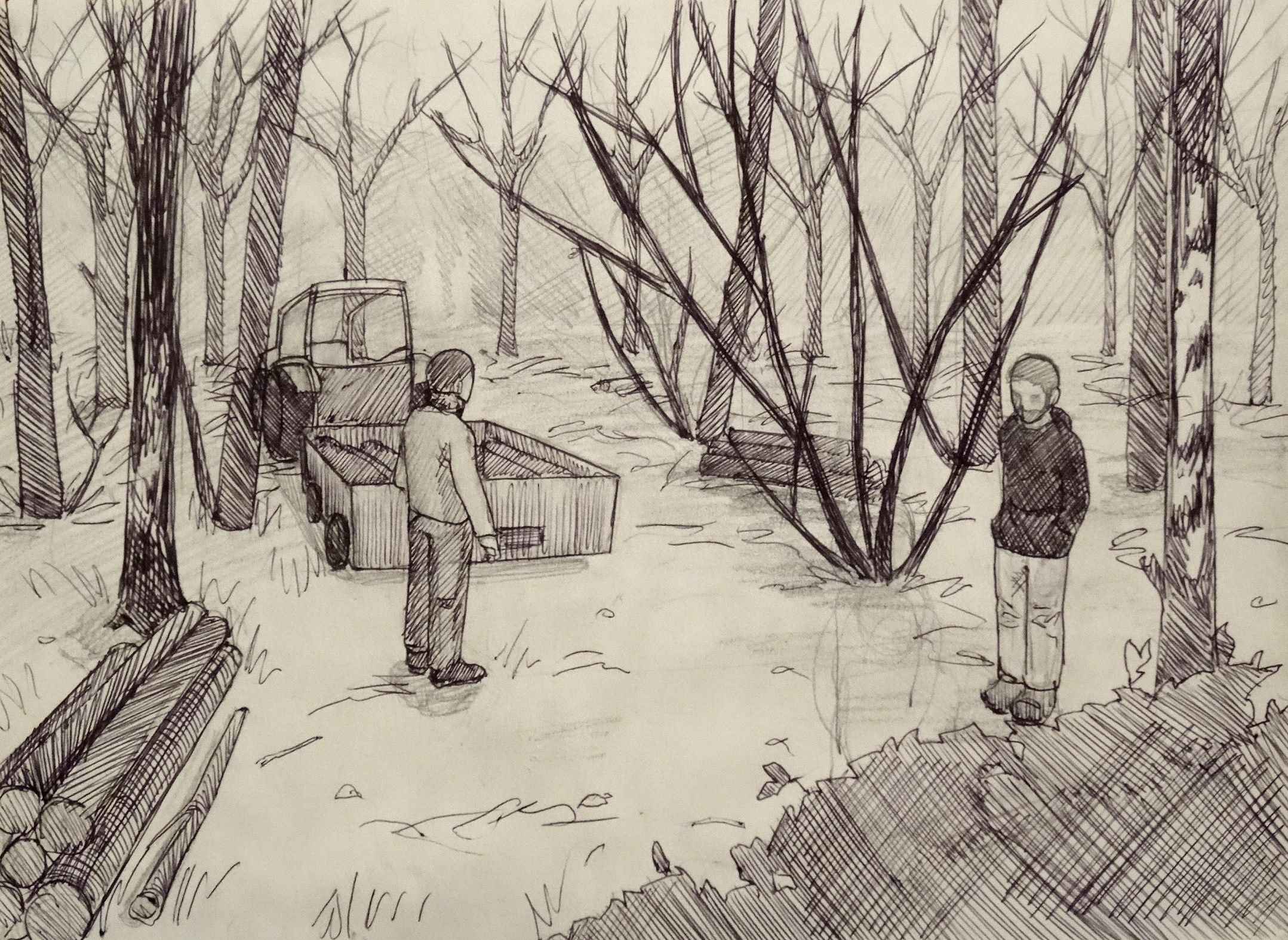 – j’ai travaillé sur la perspective géométrique (le tracteur, les deux hommes, la position des arbres dans la forêt).