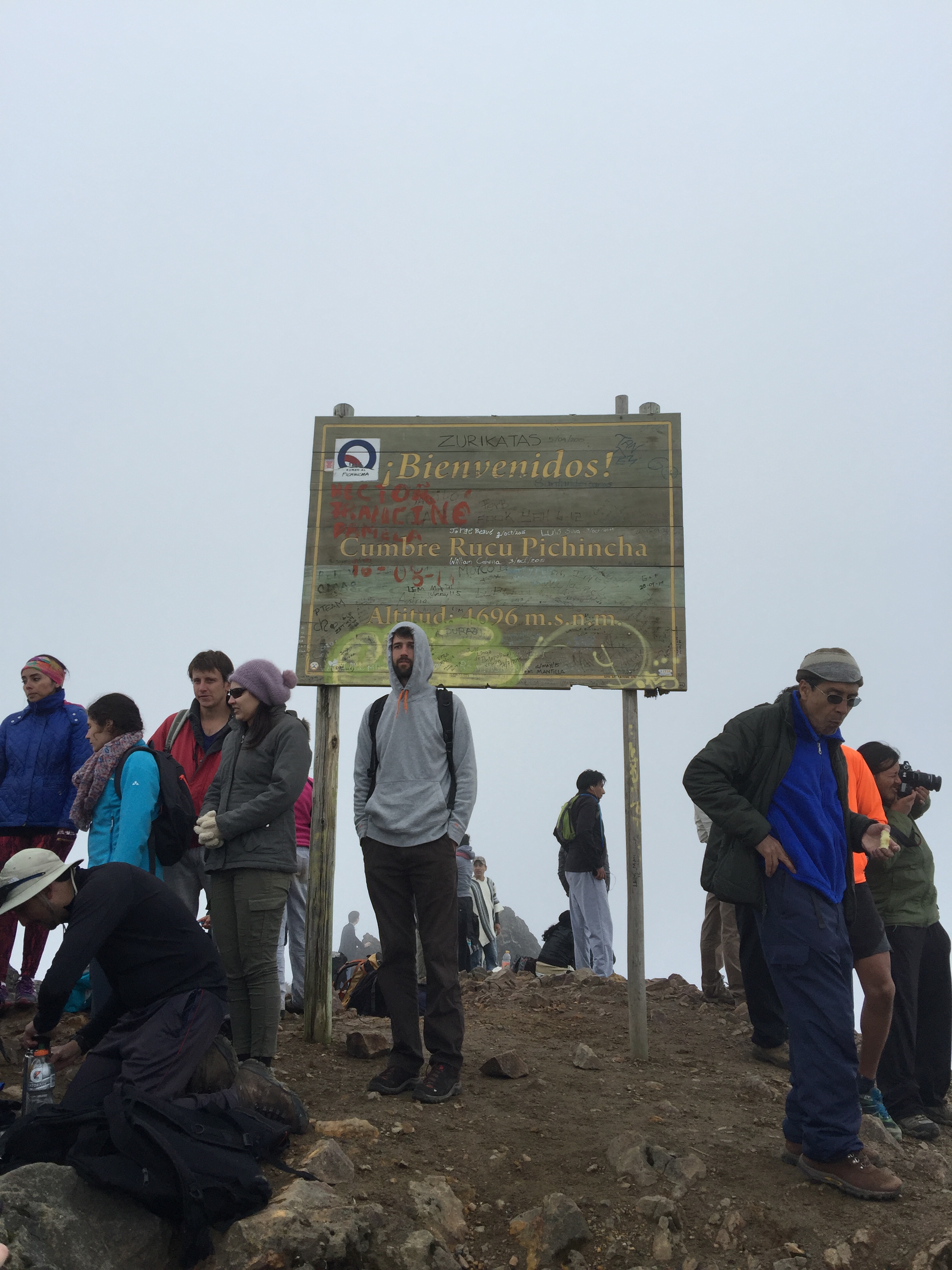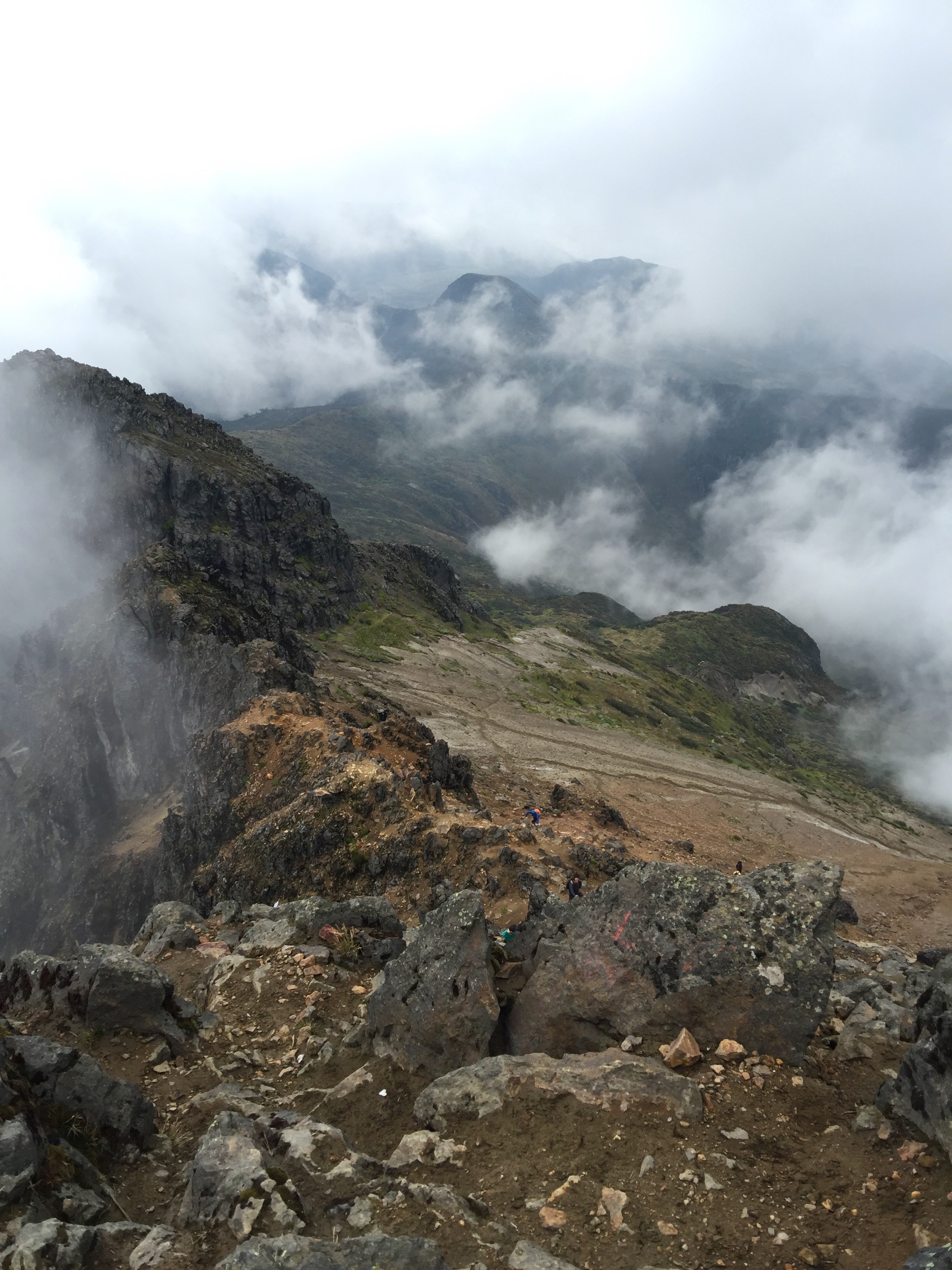 Les derniers 200 mètres (à 4500 m d’altitude donc) sont plus difficiles et nous devons escalader à moitié les rochers. Une fois en haut, tous les trekkeurs rigolent. D’abord parce qu’on ne voit rien du tout, les nuages bouchaient la vue, et ensuite suite à l’effort.