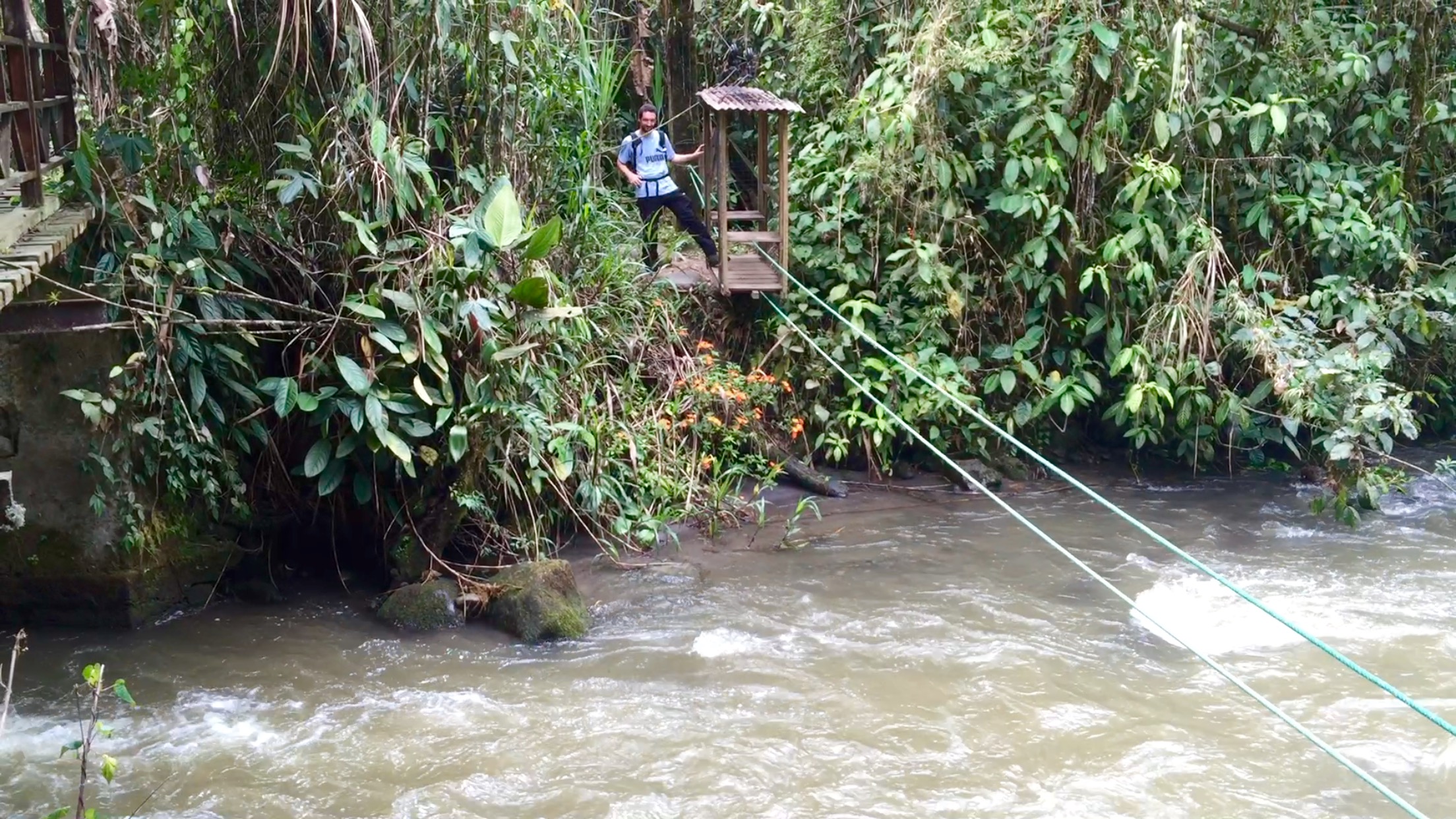 Au retour, l’application maps.me indiquait des chemins dans la brousse. Nous les avons pris pour redescendre, il y a plusieurs passage rigolos avec des cordes et nous finissons sur un carosse tyrolienne pour traverser la rivière 🙂