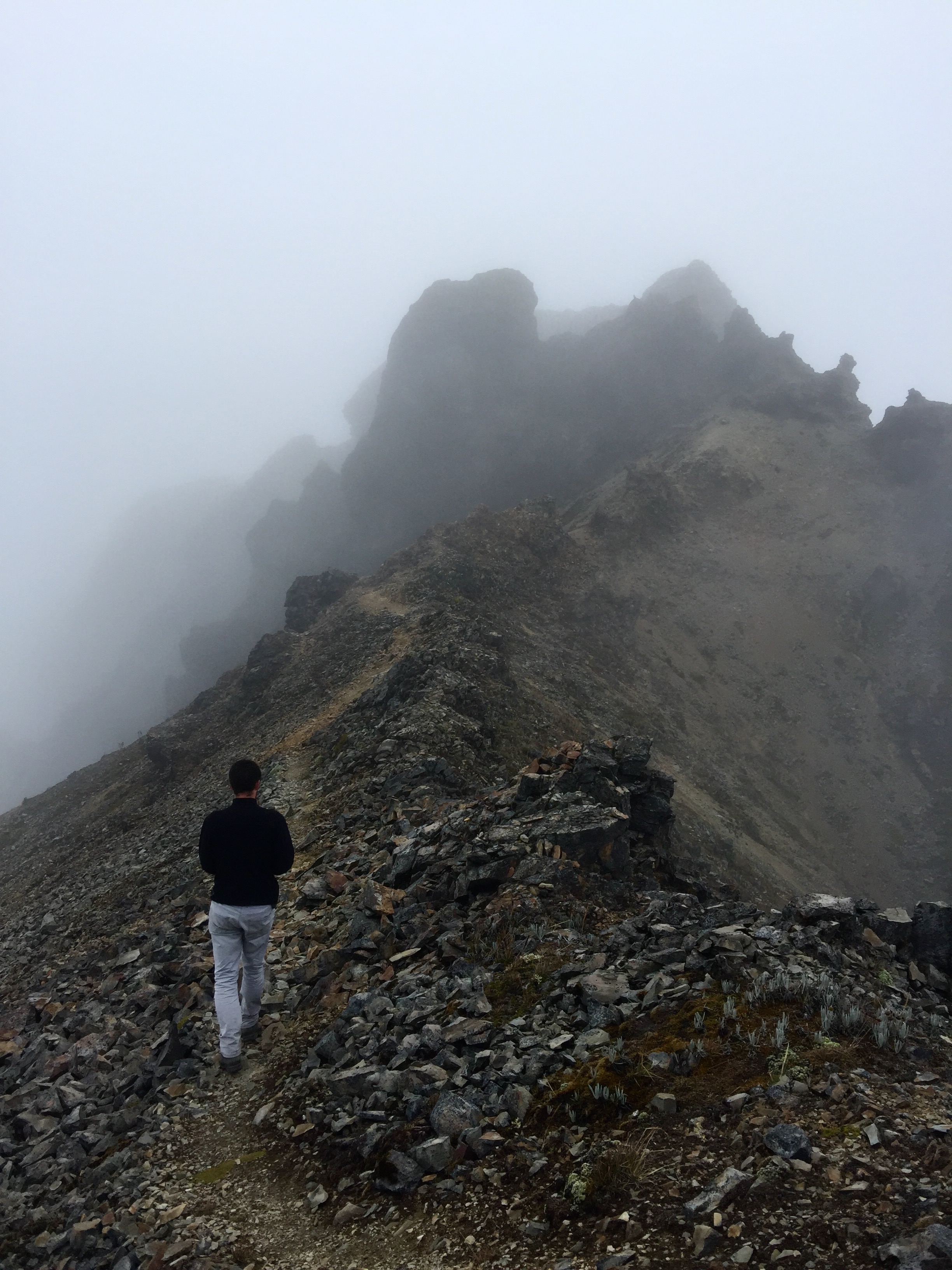 Le sommet se rapproche doucement. A droite c’est souvent le vide à pic, et à gauche tout pareil. Il faut régulièrement y mettre les mains, ne serait-ce que pour se rassurer. Et dans les nuages, nous avions sans cesse l’impression d’atteindre enfin le sommet, sans voir qu’il restait encore du chemin.