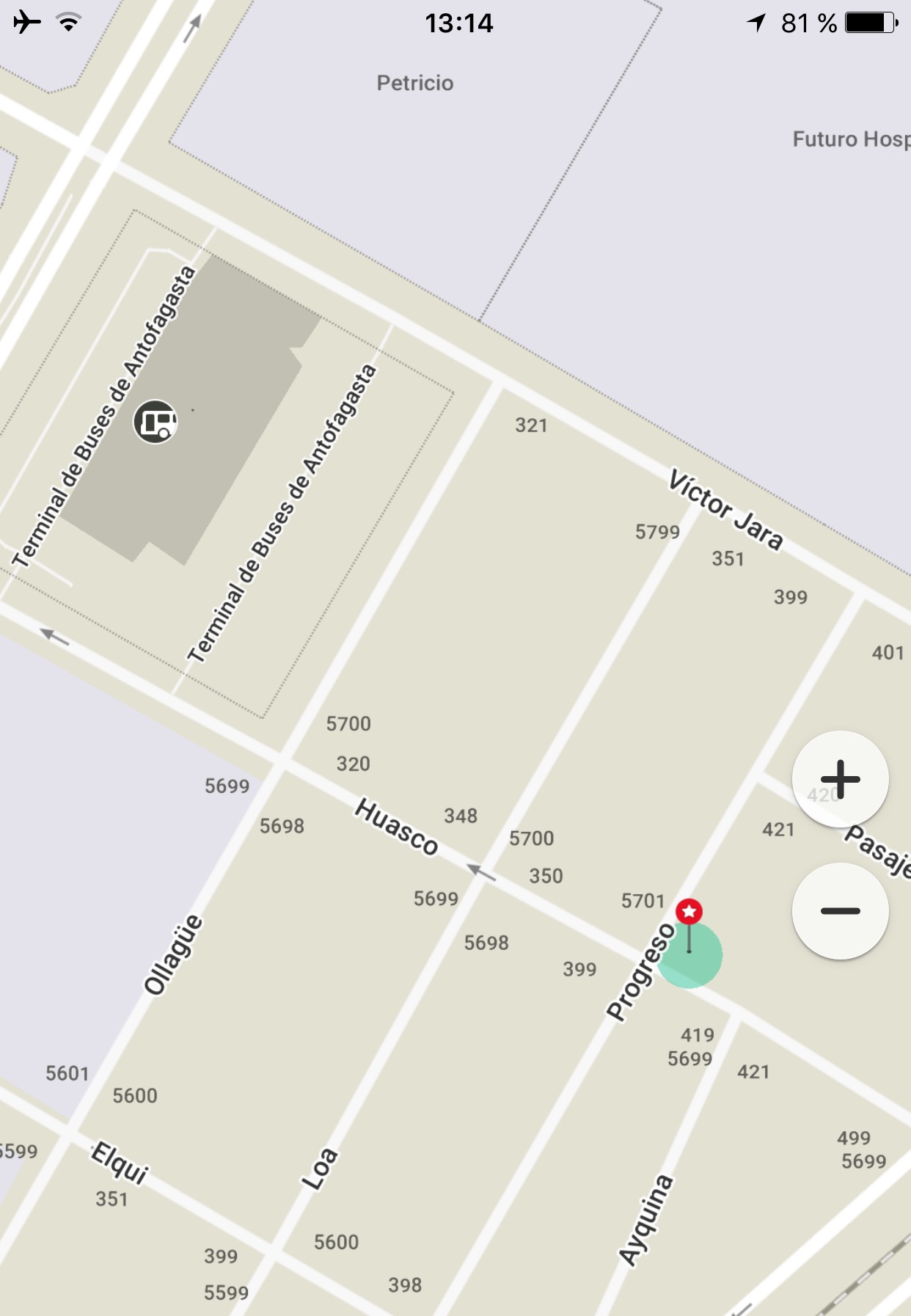 Nous nous sommes logés dans l’hôtel situé ci dessous (le petit point rouge à deux rues du terminal, pour 30 000 CLP la nuit) :