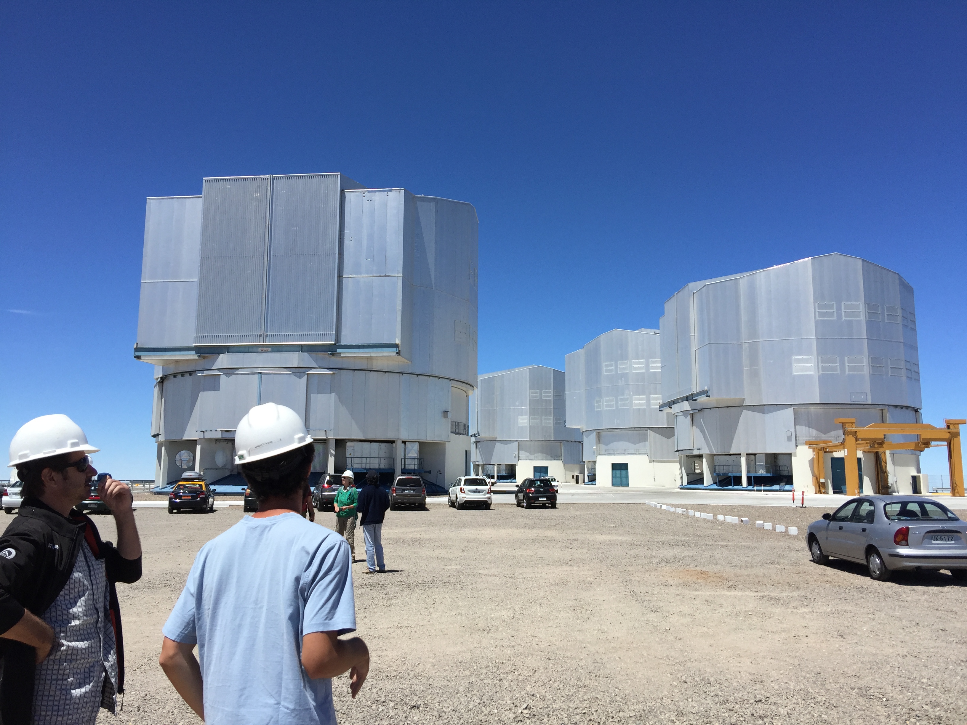 Sur la photo ci dessus, vous voyez les 4 gros télescopes du VLT, dans lesquels se trouvent les miroirs de 8,2 m de diamètre. Nous avons visité le 1er sur la droite. Autour de chaque gros télescopes, gravitent des télescopes plus petits qui se déplacent sur des rails pour former un interféromètre géant de 200m de diamètre ! Chacun d’eux contient un miroir principal d’1,8m de diamètre, ce qui se rapproche déjà plus de la taille de mon kaléidoscope.