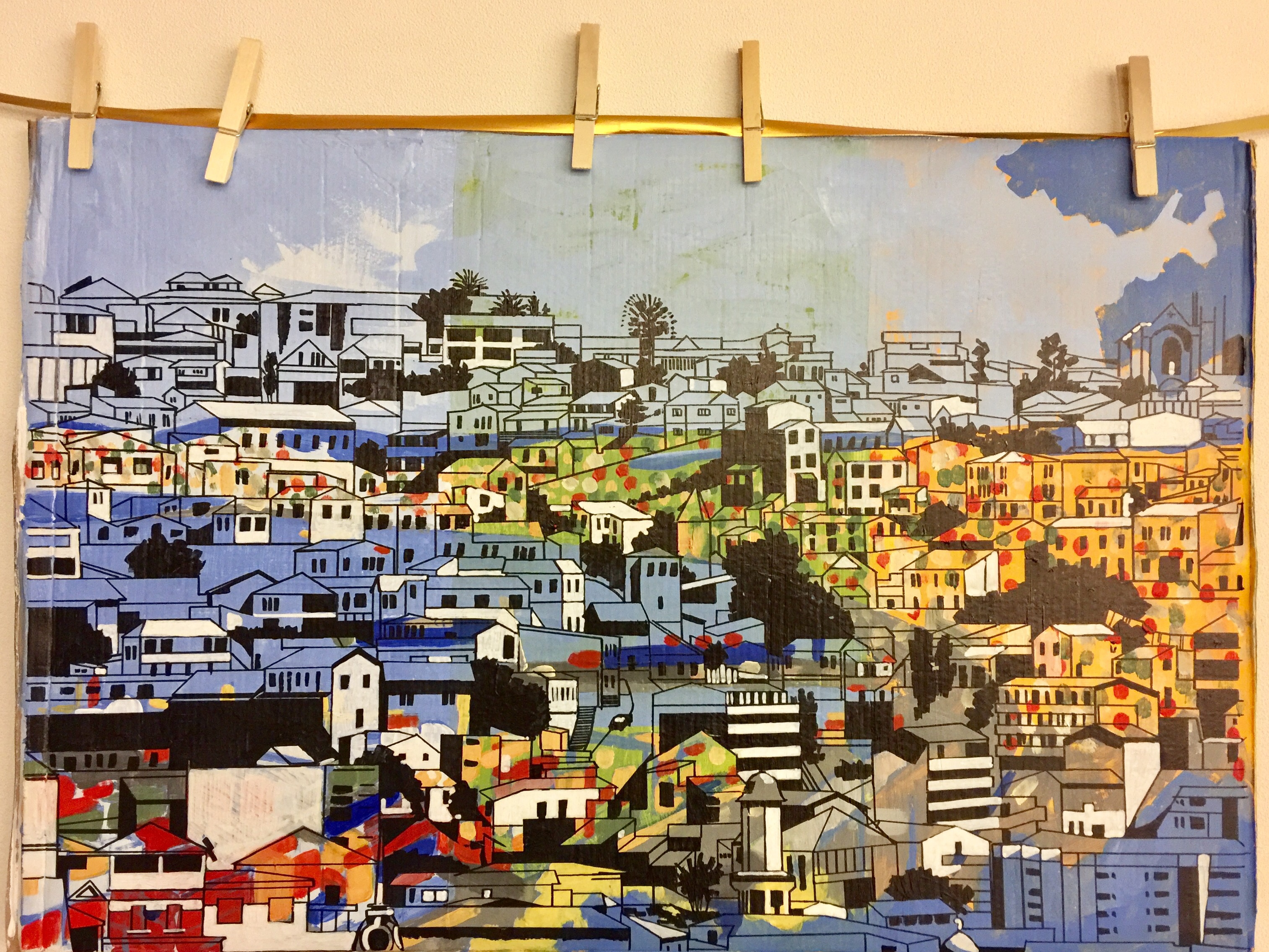 Valparaiso la ville des tags ! Cette peinture est réalisée sur carton (de déménagement) avec de l’acrylique et un marqueur noir Promarker. J’ai commencé par peindre de manière stylisée le port de Valparaiso, et j’utilise marqueurs blancs (molotow) et noir par dessus pour dessiner les batiments de la ville.