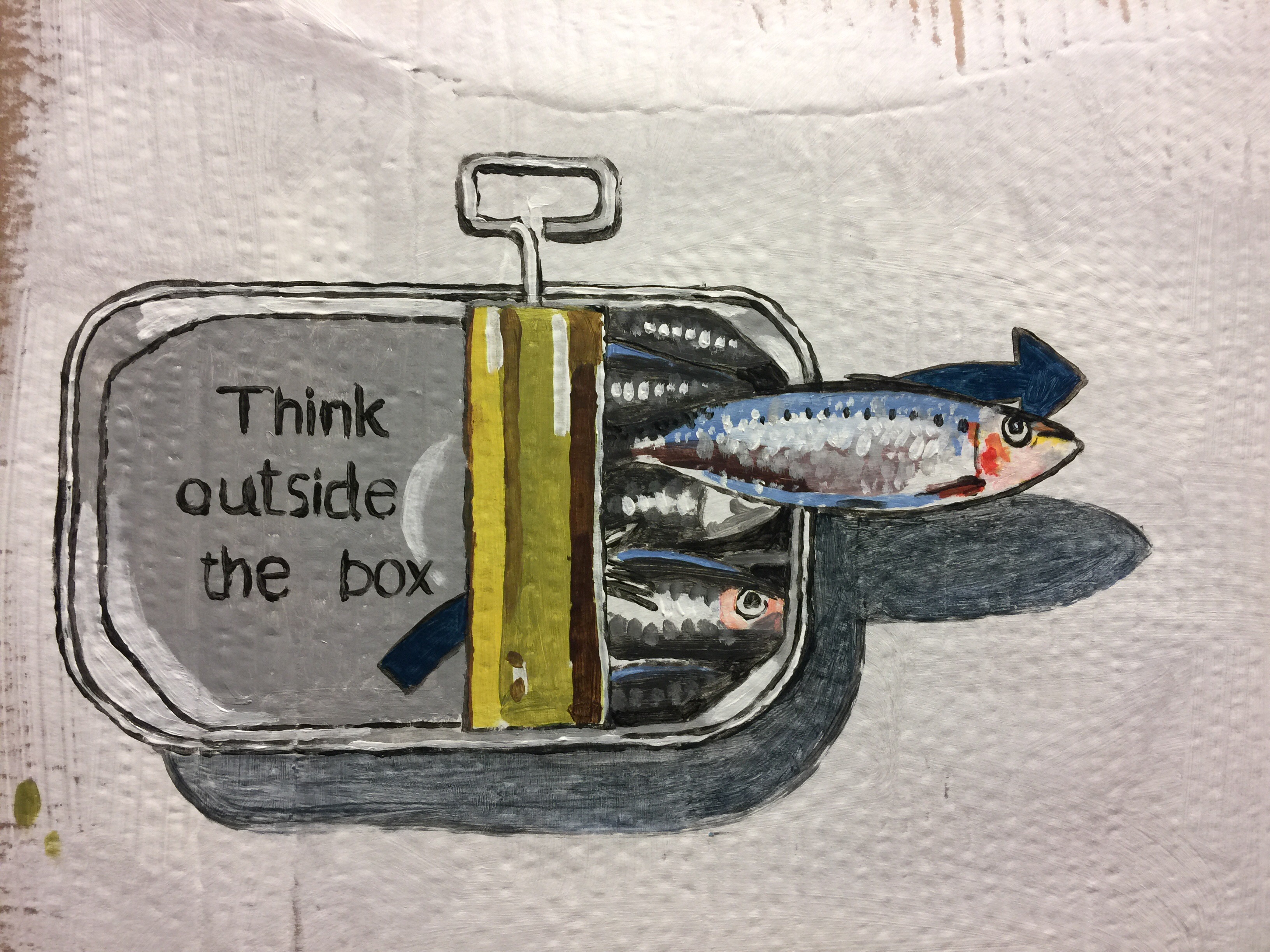 La boite, les sardines et la flèche sont peintes à l’acrylique. J’ai taillé un pochoir dans du carton pour réaliser le message à la bombe de peinture. Finalement ça aurait peut-être été aussi simple au vidéo projecteur, à condition de le mettre à la bonne hauteur.
