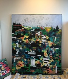 Après un certain nombre d’essais, voici le résultat final pour la représentation moderne de Valparaiso. Cette toile sera exposée dans les locaux de BAP.