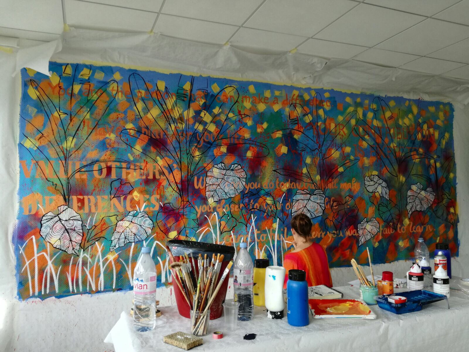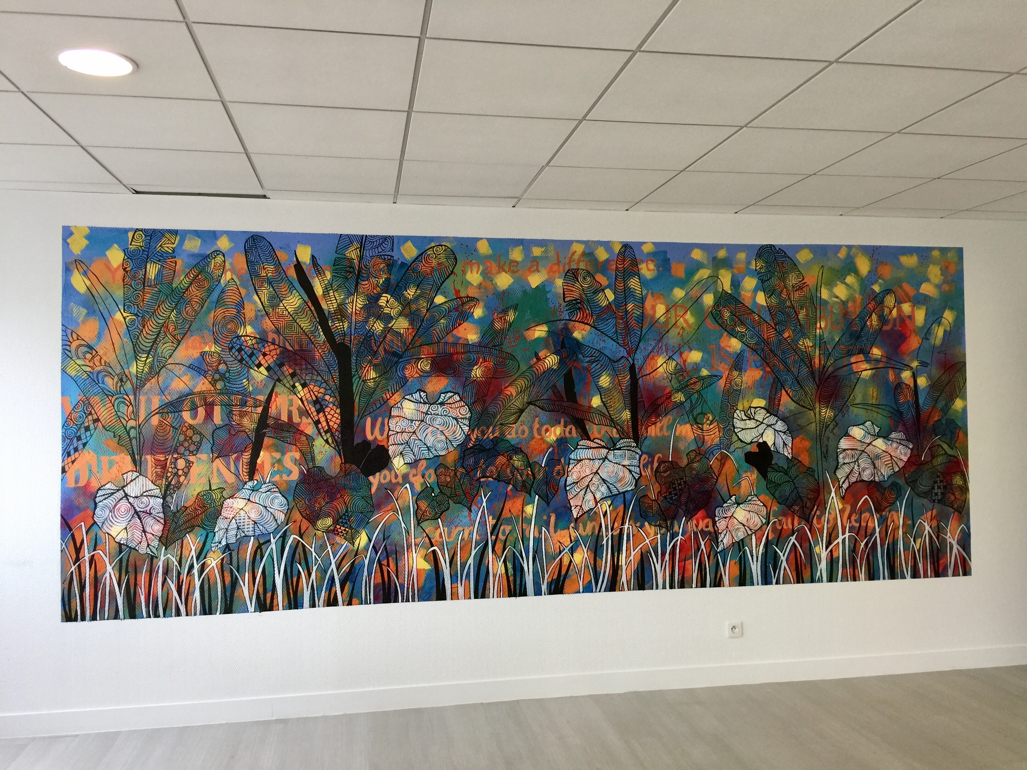 Voici le résultat sur un mur de 2m par 5m. La fresque est émaillée de messages d’inspiration à déchiffrer.
