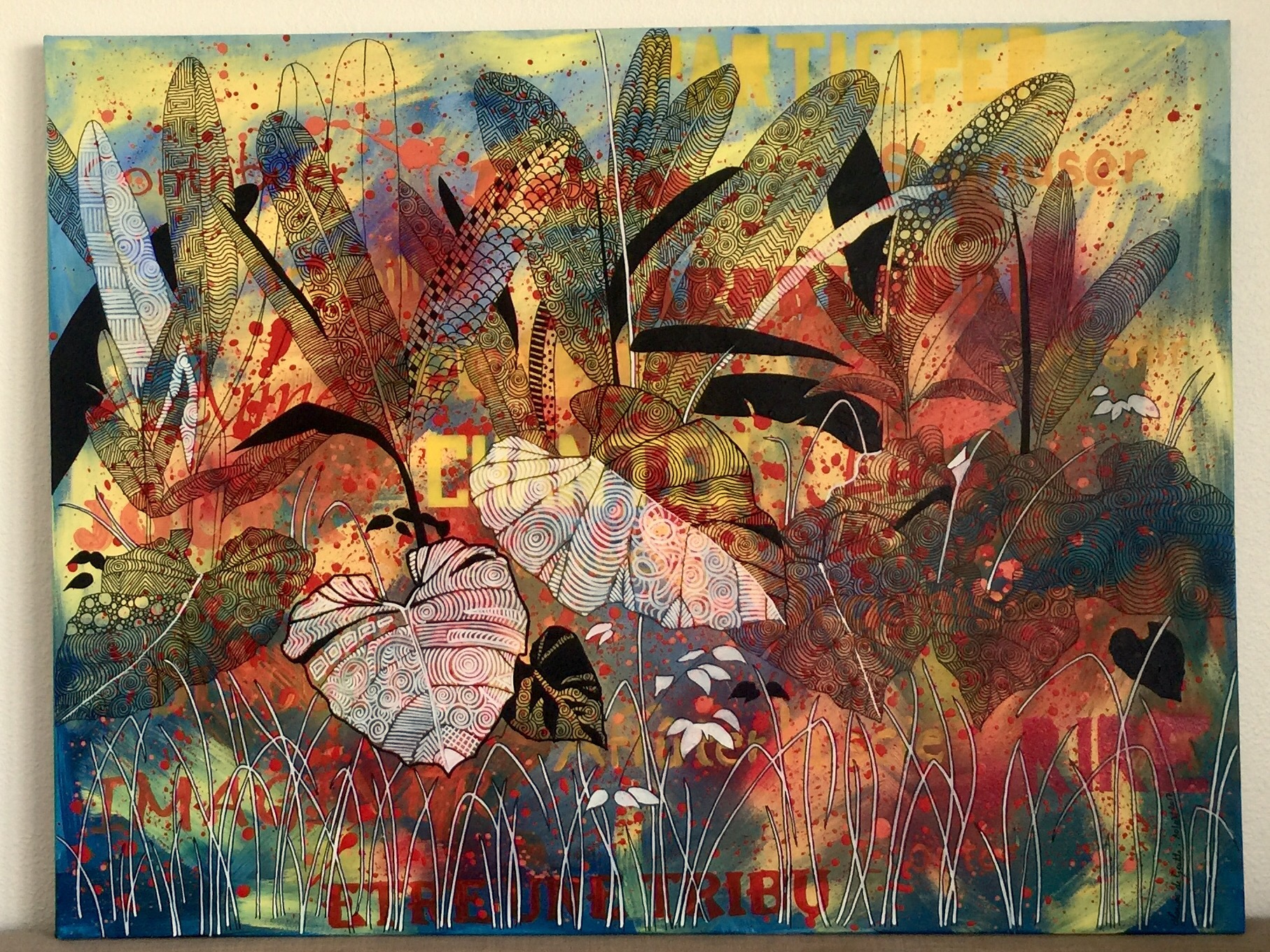 Encore un tableau de forêt et ce ne sera certainement pas le dernier, même si je vais explorer d’autres motifs que les feuilles de plantes exotiques.