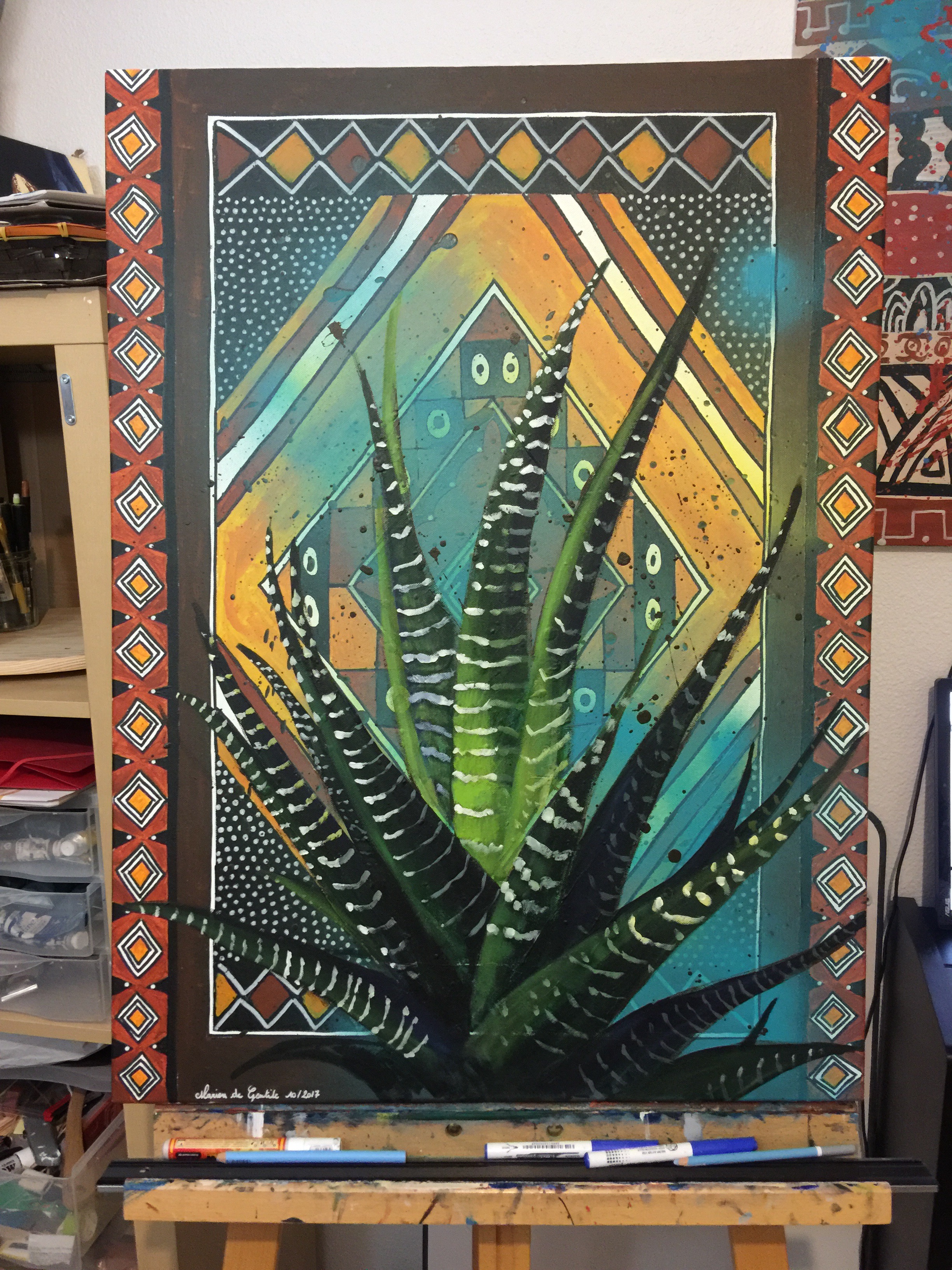 Technique : Acrylique, bombe graffiti, marqueur sur toile.