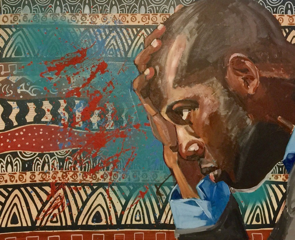 Ce tableau est un nouveau portrait de Mohandas, que j’appris pour son histoire personnelle riche en symboliques.